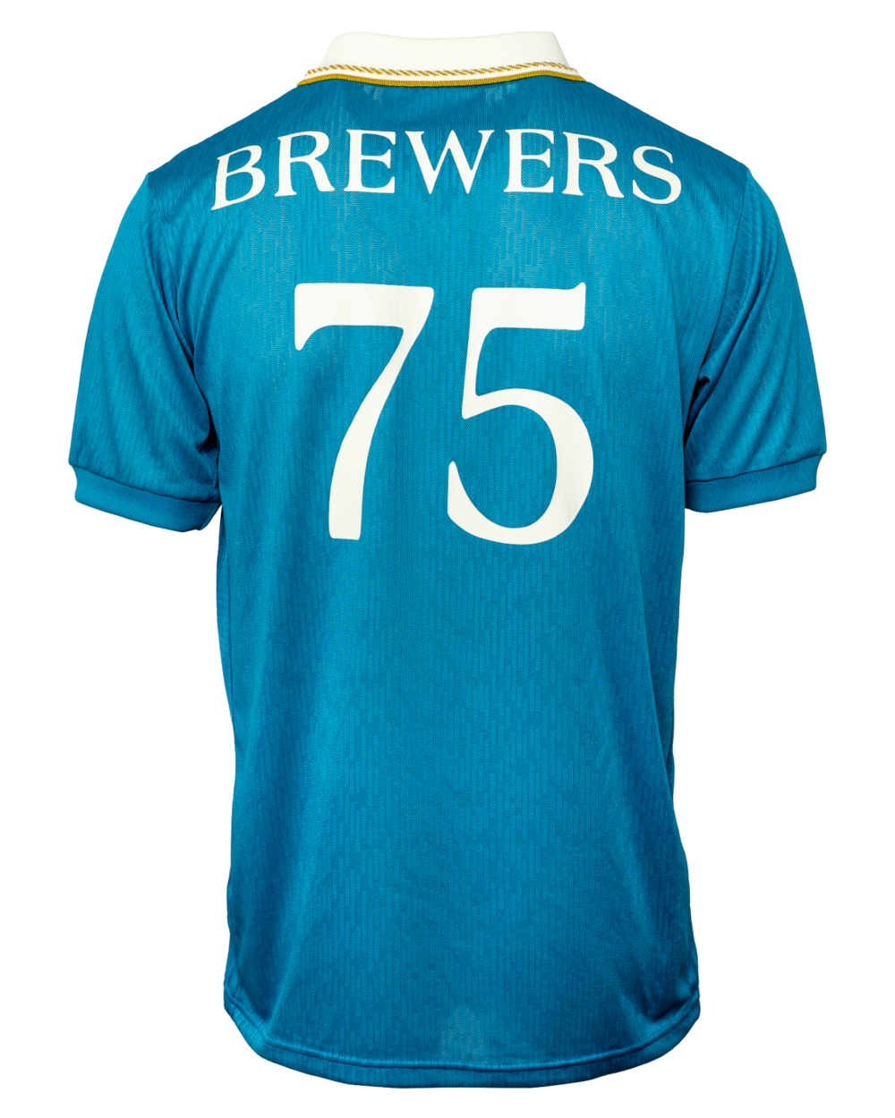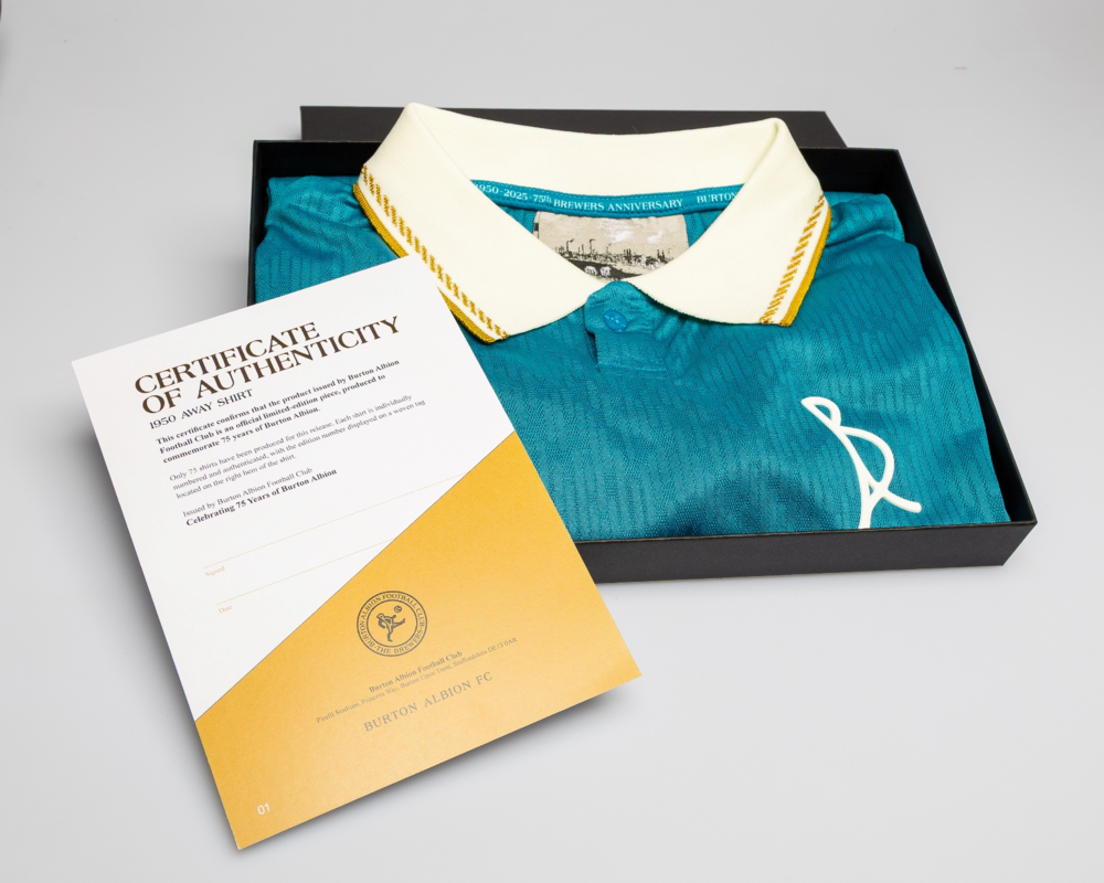 The sponsor is removed and replaced with 1950 across the shirt — the year Burton Albion was founded. On the back, Brewers 75 marks seventy-five years of the club, past and present connected in one clean detail.